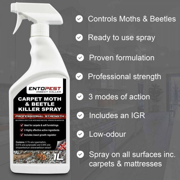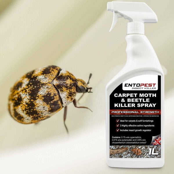 Entopest Insect Killer Spray is ready for use water-based spray specifically designed to control carpet beetle (Anthrenus verbasci) & case-bearing clothes moth, aka carpet moth (Tineola bisselliella). Ideal for spot treatments on carpets and other locations associated with carpet moth & beetle.