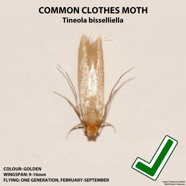 Entopest moth pheromone has been designed specifically for the control of Tineola bisselliella (Common Clothes Moth aka Webbing Moth) only. It will not work with other species of moth.