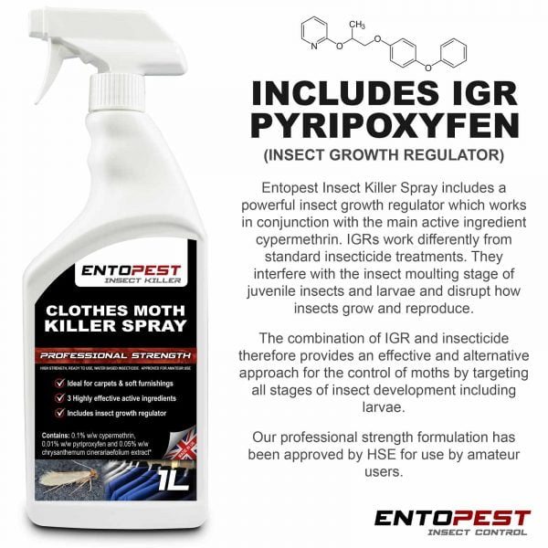 Insect growth regulators are considered an important mode of control when dealing with established moth infestations. IGR works by breaking the life cycle to disrupt an insect’s normal growth pattern. Juveniles exposed to pyriproxyfen will be sterile as adults, thus stopping the constant cycle of reproduction in an infestation.